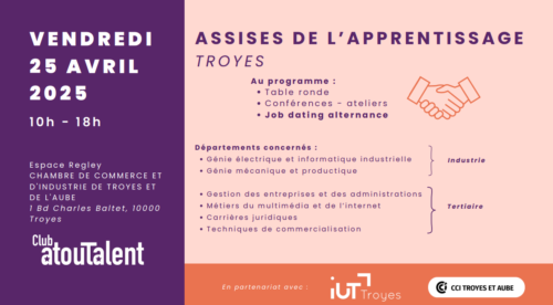 – les Assises de l’apprentissage, le vendredi 25 avril à la CCI de Troyes, en partenariat étroit avec l’IUT de Troyes et la CCI de Troyes et Aube ;